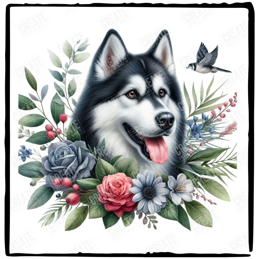 Cute Dog Siberian Husky Breed Floral Design