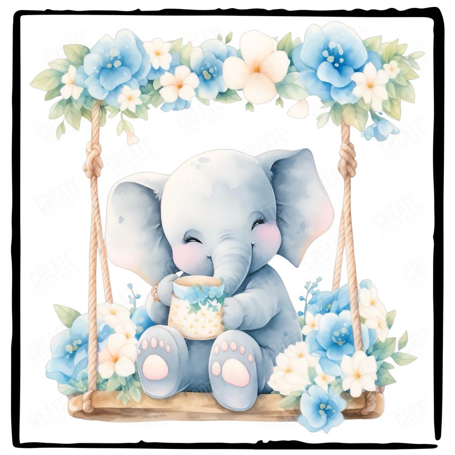 Cute Blue Elephant On Floral Swing Pattern Design