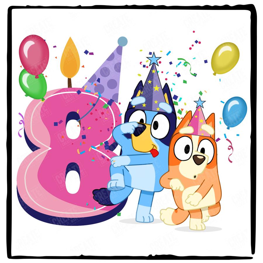 Happy Bluey & Bingo Character 8th Birthday Pink Number Design
